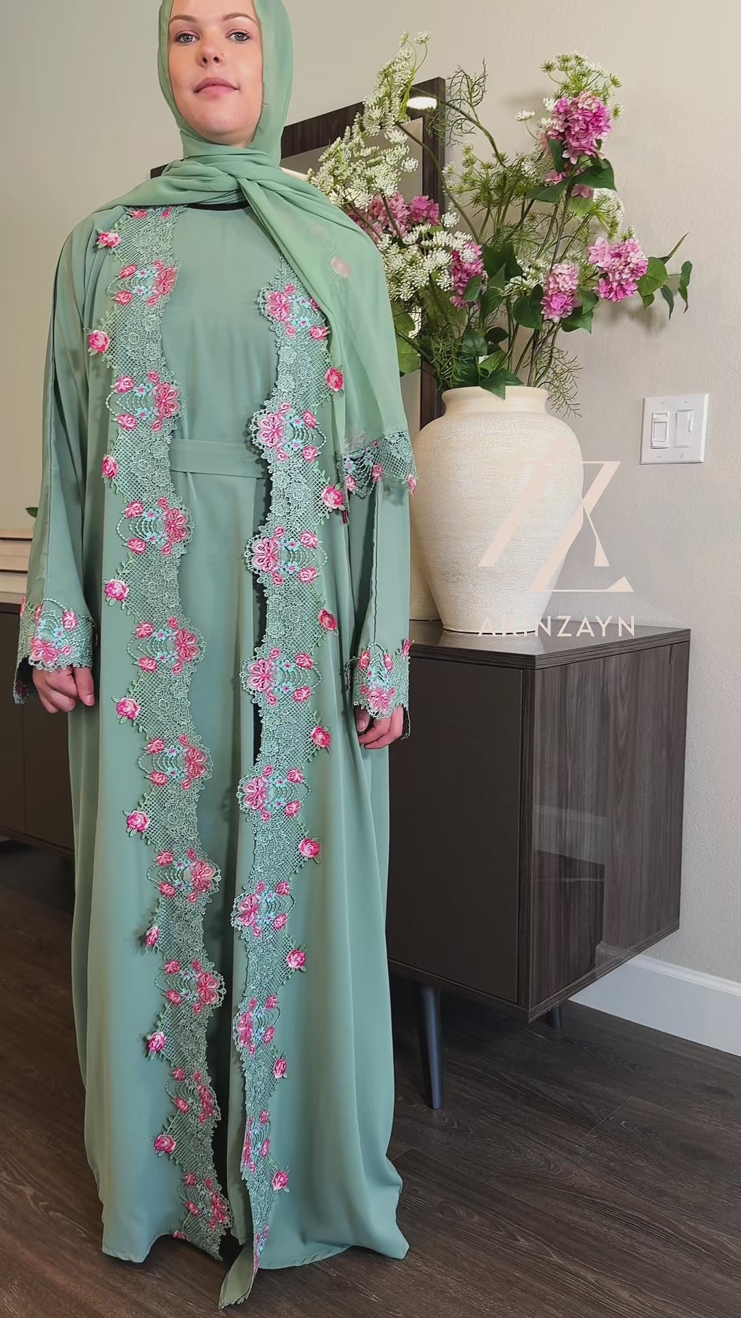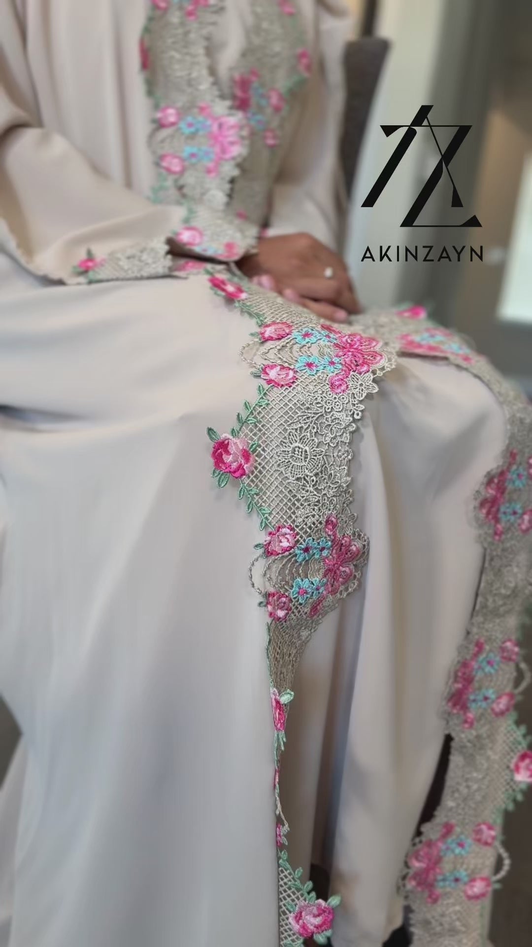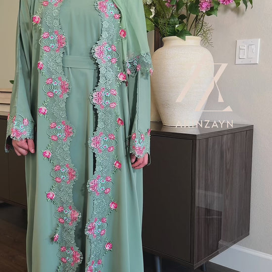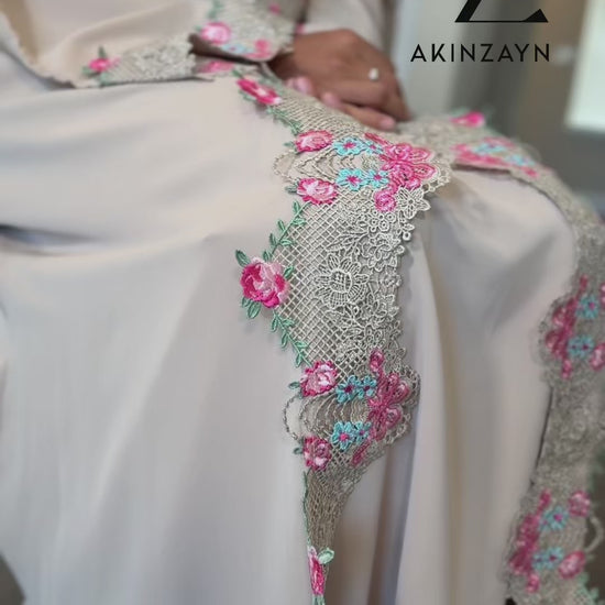 Elevate your modest wardrobe with the Aaliyah Floral Abaya Set from Akinzayn. A masterpiece of elegance and grace. Crafted in a soft beige and sage hue, this abaya features intricate lace embroidery adorned with stitched floral patterns in shades of pink and blue. The delicate detailing cascades along the front panel, sleeves, and cuffs, adding a refined touch of femininity to every movement.