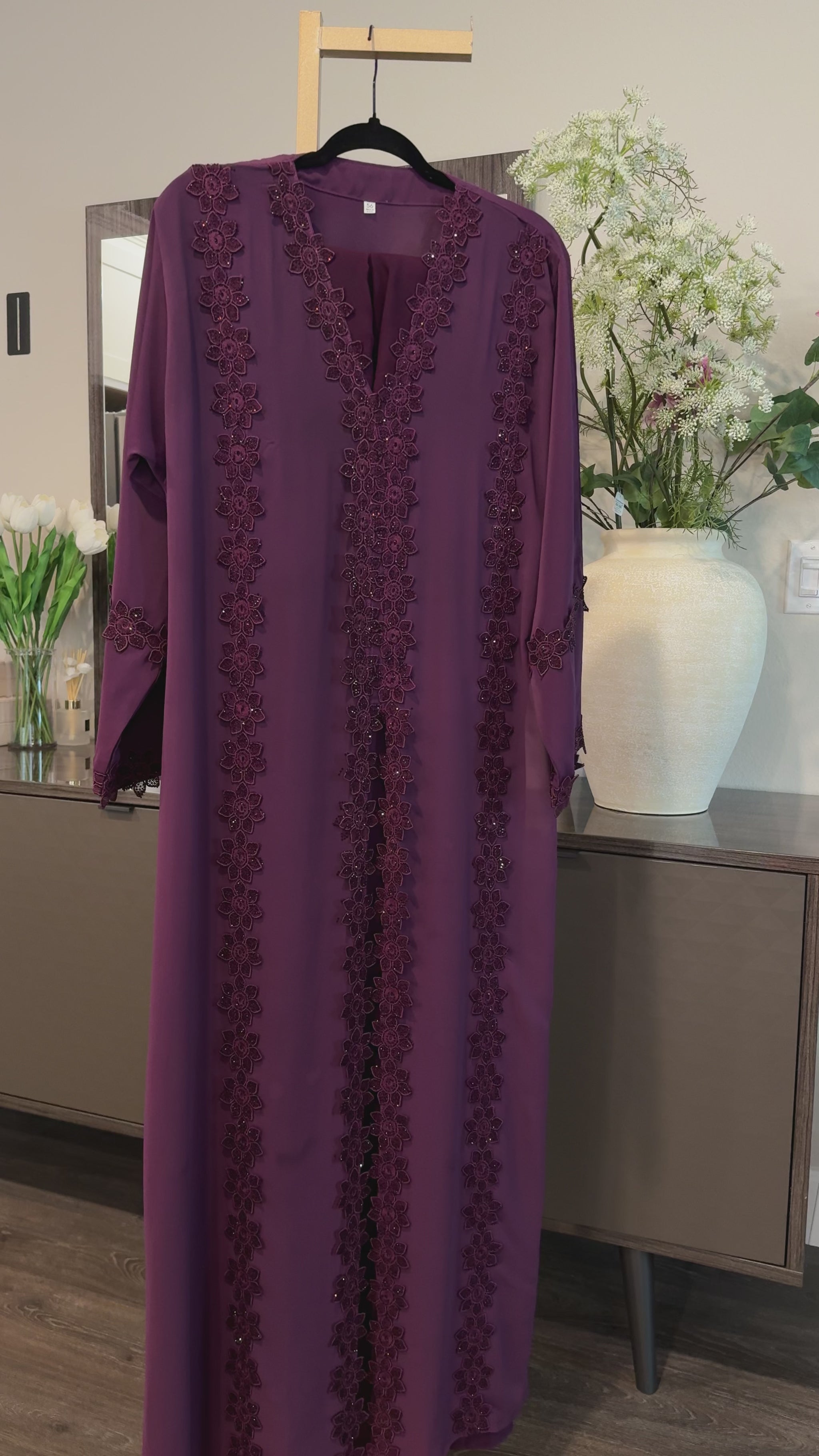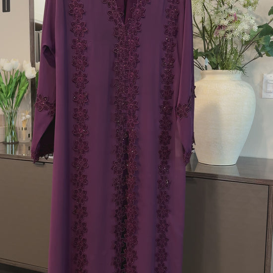 Elegant and timeless, the Amethyst Bloom Kaftan is designed to embody grace and sophistication. Crafted in a rich plum-purple tone, this flowing piece features delicate floral lace embroidery that cascades beautifully down the front, creating a refined and feminine silhouette.