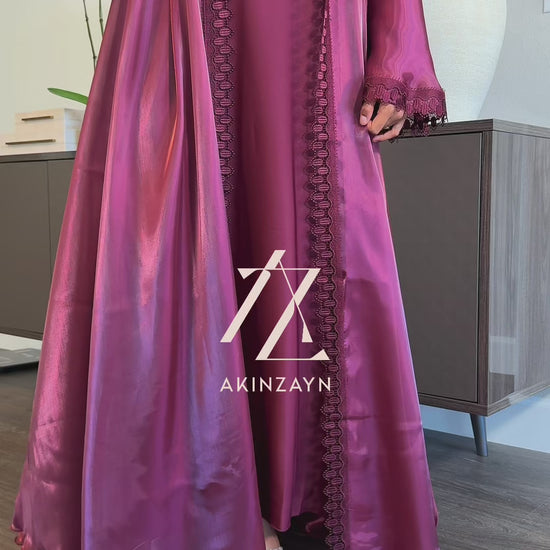 Crafted from a luxurious organza fabric with a luminous sheen, this abaya radiates understated opulence. The deep maroon hue and navy blue, paired with intricately embroidered lace trim along the front and cuffs, creates a look that is both regal and refined.