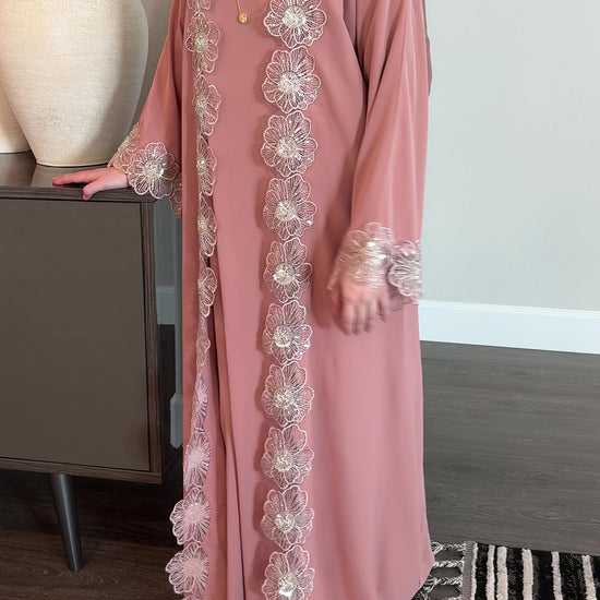 The Petal Grace Abaya is a timeless piece designed for women who love elegance and modest fashion. Crafted from soft, flowing fabric in a beautiful dusty pink shade, this abaya features stunning floral lace appliqué with delicate stone embellishments that run gracefully along the front and cuffs.